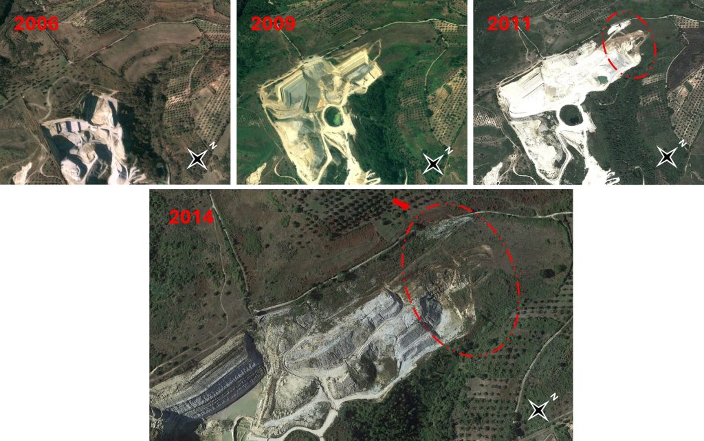 La consultazione delle immagini satellitari storiche ha fornito l’evoluzione morfologica del fronte di cava che, a partire dal 2006, è stato man mano ampliato in direzione nord; già nel 2011 i versanti hanno manifestato i primi segni di instabilità e, tra il 2013 e 2014, la retrogressione di un corpo di frana ha interdetto la viabilità della strada comunale posta a monte (Figura 1).