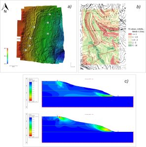 2) modelli numerici agli elementi finiti FEM (Figura 2c) per analisi di stabilità su sezioni bidimensionali (ricavate dal modello ad elevata precisione del rilievo drone) ad individuare i potenziali fenomeni di frana.